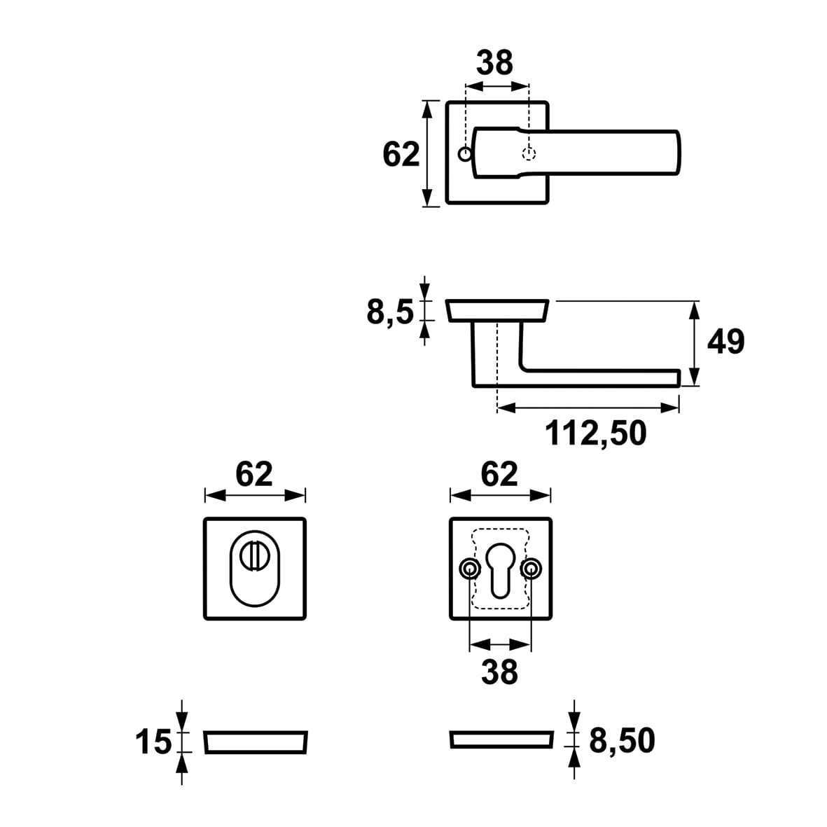 W zestawie znajdują się: klamka i szyld od strony wewnętrznej pomieszczenia , oraz szyld od zewnątrz.