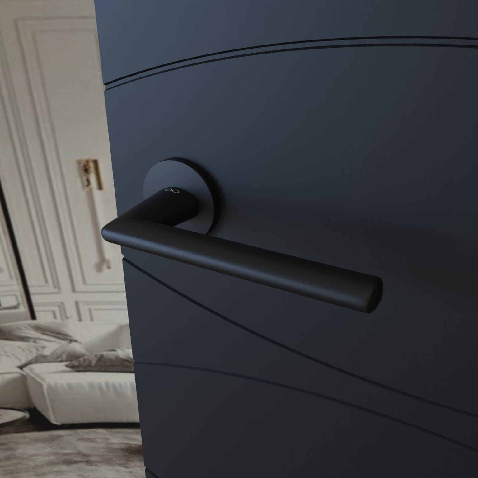 Model EVA KEVA O B00 to klamka wewnętrzna o eleganckim i ponadczasowym wyglądzie. Osadzona na subtelnie wyprofilowanym, okrągłym szyldzie o grubości zaledwie 5 mm, świetnie sprawdza się w nowoczesnych i klasycznych aranżacjach drzwiowych. Jej czarny, matowy kolor dodaje wnętrzu wyrazistości i stylu.