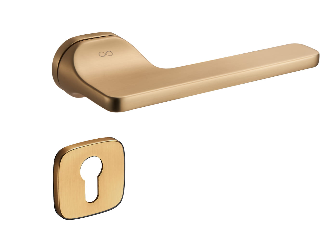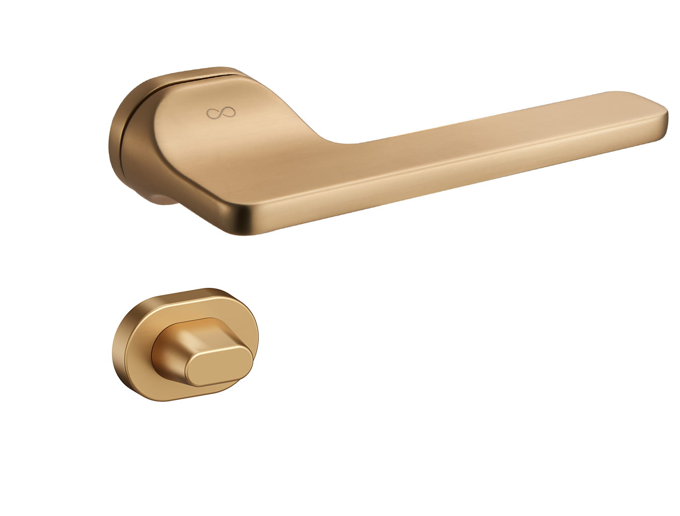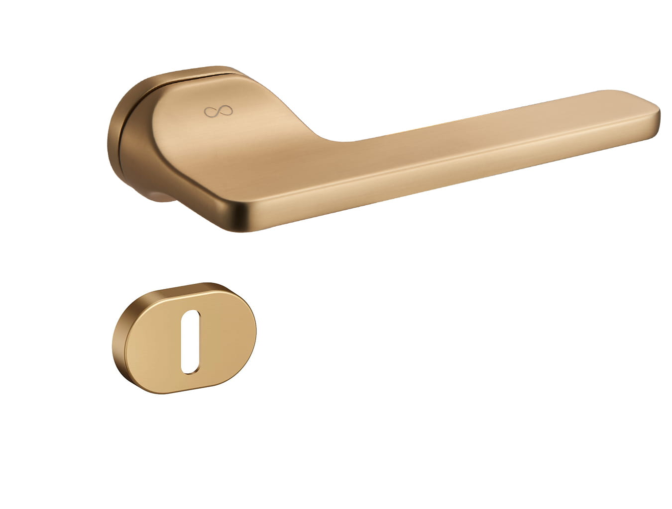 Minimalistyczna linia klamki i owalna rozeta o grubości zaledwie 7 mm tworzą efekt lekkiej, nowoczesnej formy. Zastosowany kolor złoty mat wprowadza do wnętrza ciepło i elegancję, doskonale komponując się zarówno z klasycznymi, jak i nowoczesnymi aranżacjami.