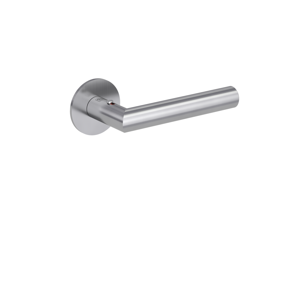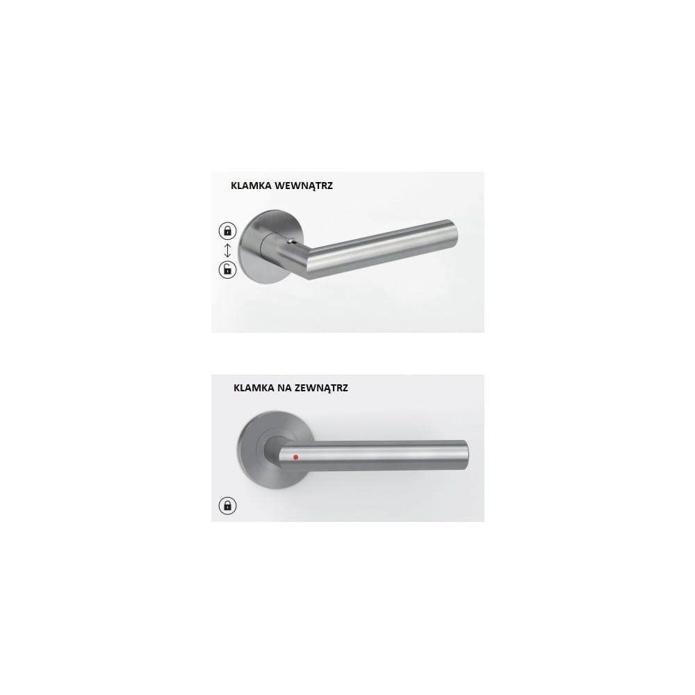 Klamka posiada zintegrowany system zamykania umieszczony w uchwycie, który daje jednocześnie natychmiastowy podgląd czy drzwi są zamknięte (czerwona kropka ).