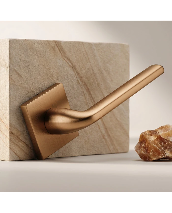 Model ten zachwyca eleganckim, ciepłym odcieniem inspirowanym naturalnymi tonami ziemi, który został wzbogacony subtelną, metaliczną nutą. Jego satynowa powierzchnia delikatnie rozprasza światło, nadając klamce wyrafinowany charakter bez zbędnego połysku. To barwa ponadczasowa, łącząca nowoczesny design z klasyczną harmonią, a jednocześnie niezwykle praktyczna – matowa powłoka ułatwia utrzymanie powierzchni w czystości.