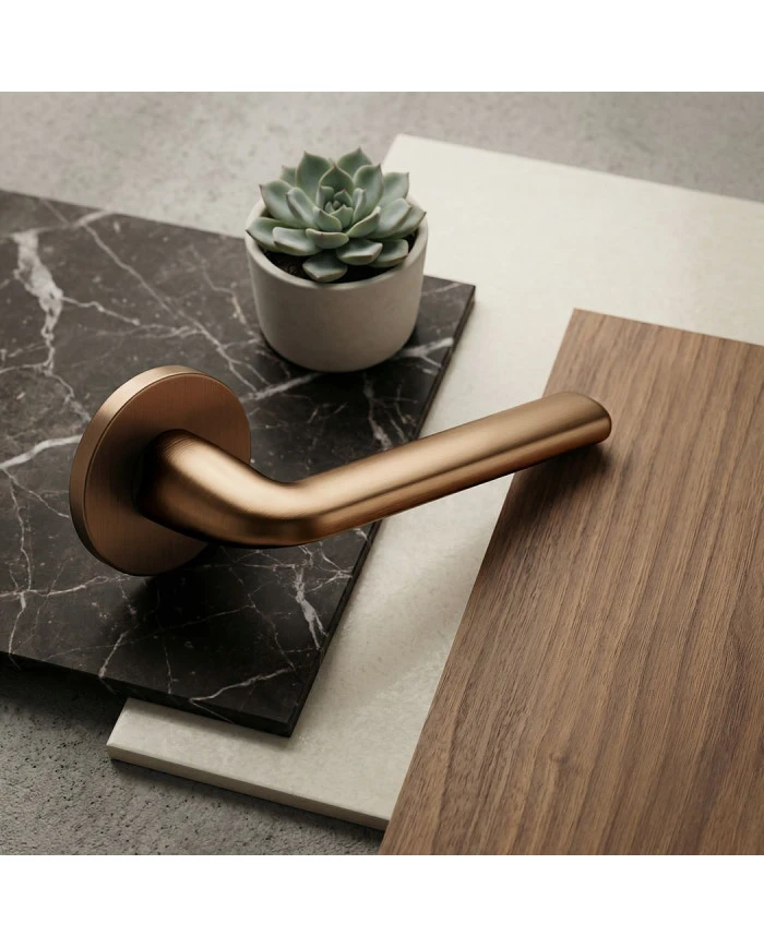 Model Scandi Slim z okrągłą rozetą to kwintesencja nowoczesnego designu i subtelności. Wyjątkowo płaski profil typu slim (zaledwie 6 mm grubości) w połączeniu z aksamitnym wykończeniem w odcieniu matowego brązu tworzy spójną całość, która uszlachetni każde skrzydło drzwiowe. Ergonomiczna, lekko zaoblona rękojeść gwarantuje komfort codziennego użytkowania, wpisując się w estetykę wnętrz loftowych, skandynawskich oraz premium.
