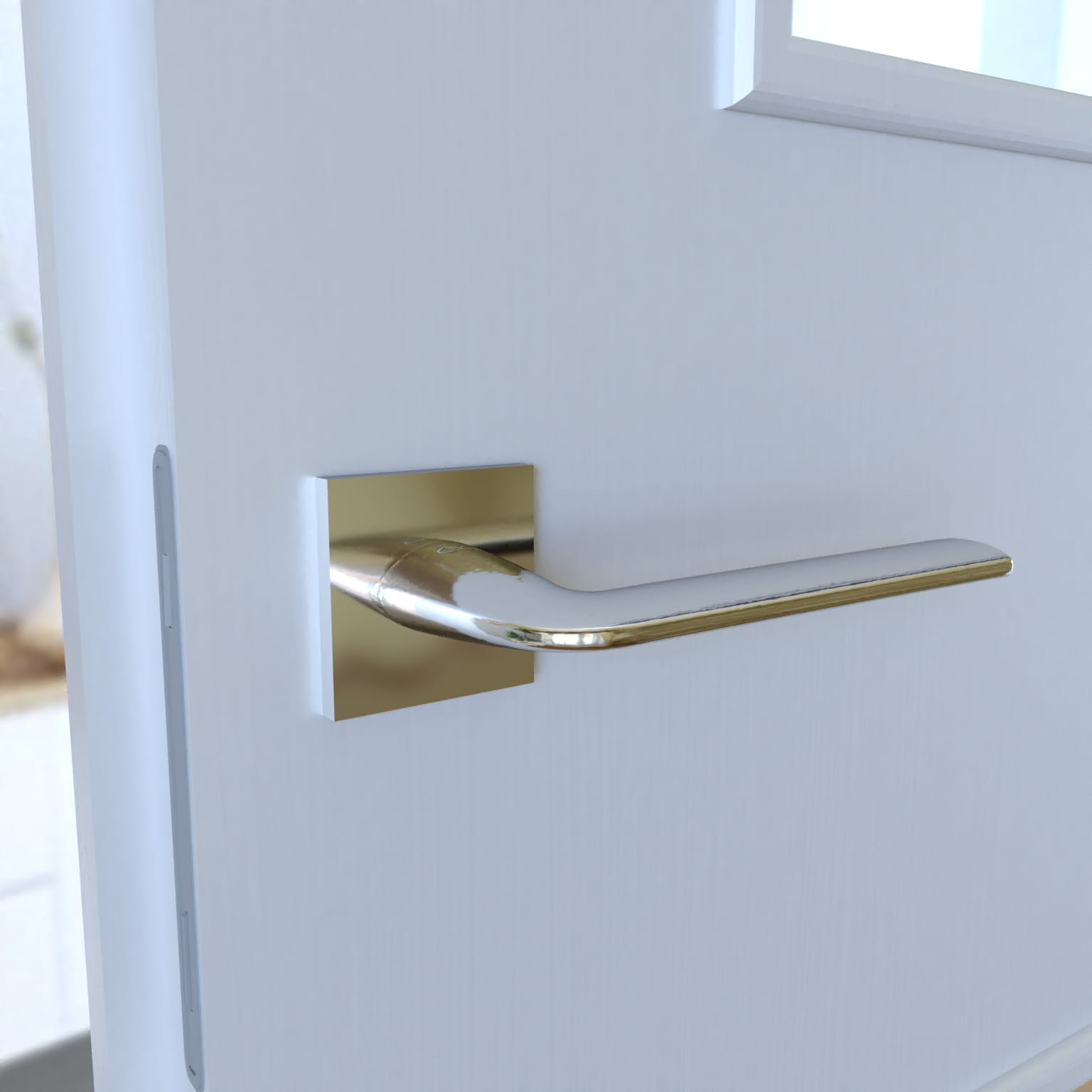 Klamka dzielona na szyldzie kwadratowym, z wspomaganiem dwustronnym.