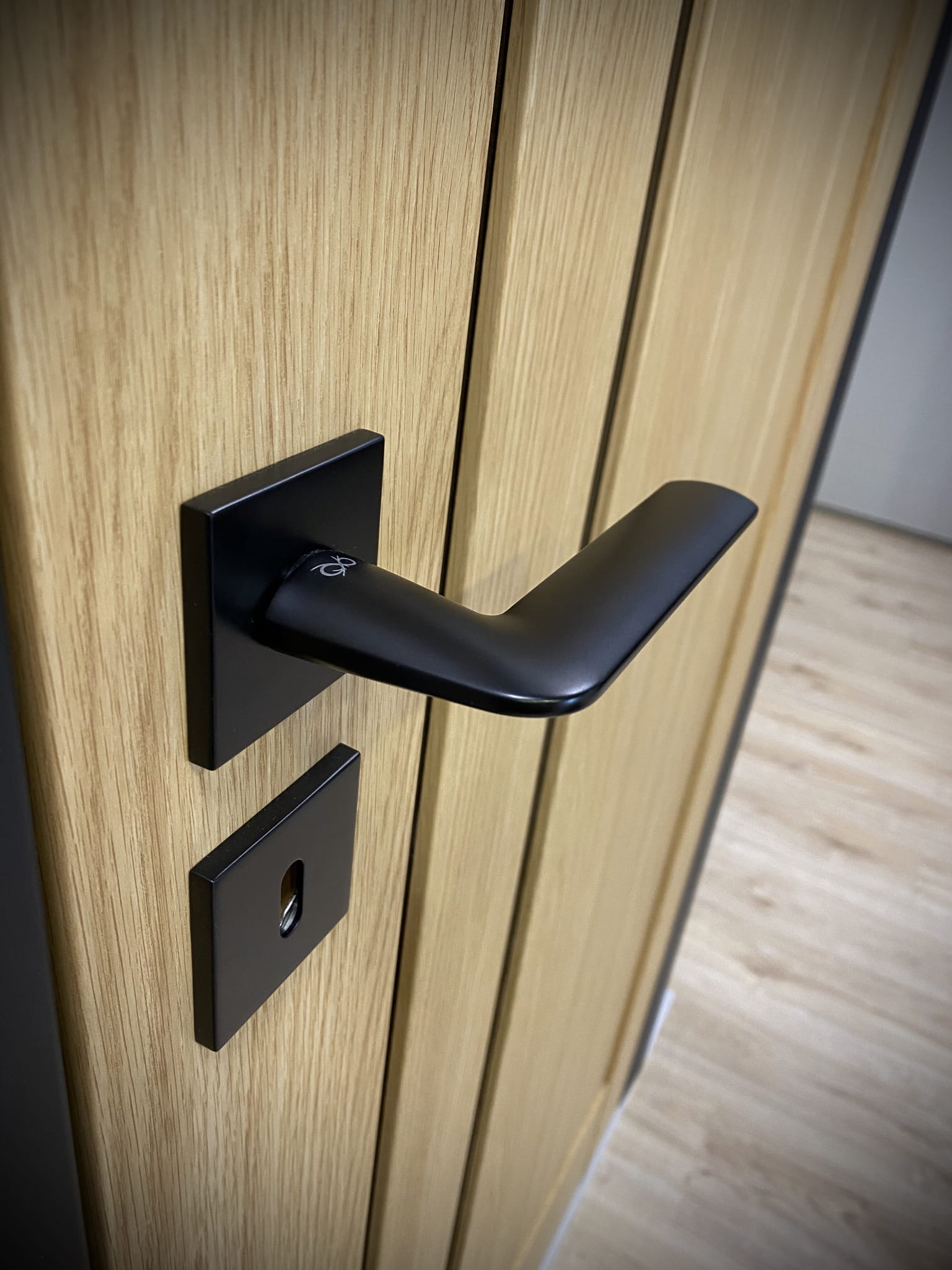 W komplecie znajdują się dwie klamki i zestaw montażowy.