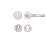 W komplecie znajdują się : klamka od strony wewnętrznej pomieszczenia, gałka stała od strony zewnętrznej oraz dwa dolne szyldy do zamka z otworem na wkładkę, nowatorskie zabezpieczenie wkładki typu FLEX o tolerancji 6 mm.