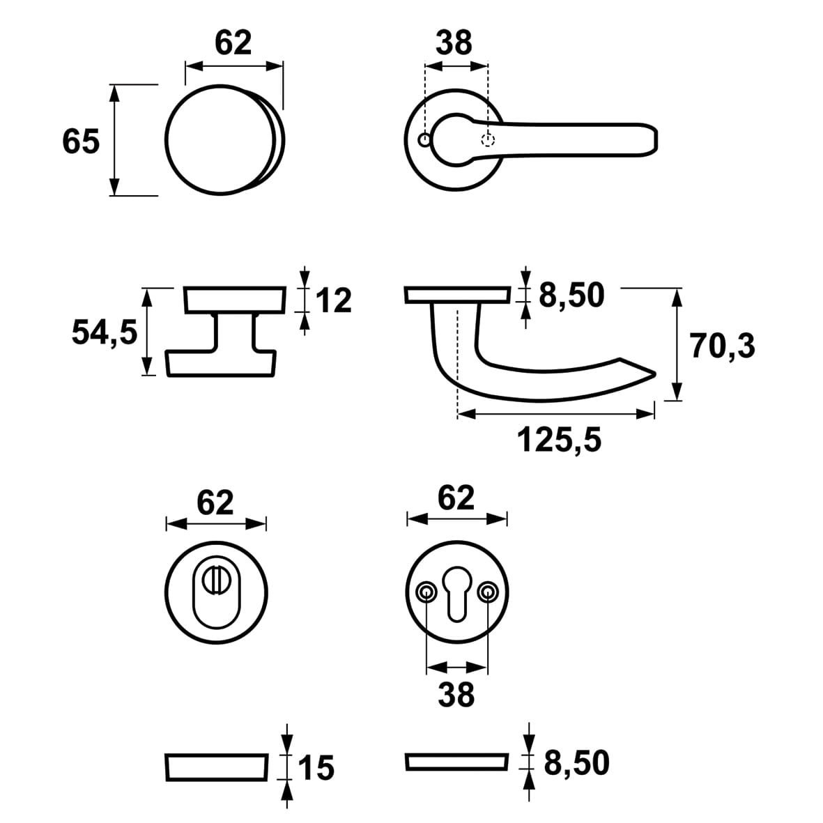 W standardzie : trzpień 150 mm(pływający) do klamki, śruby 100 mm.