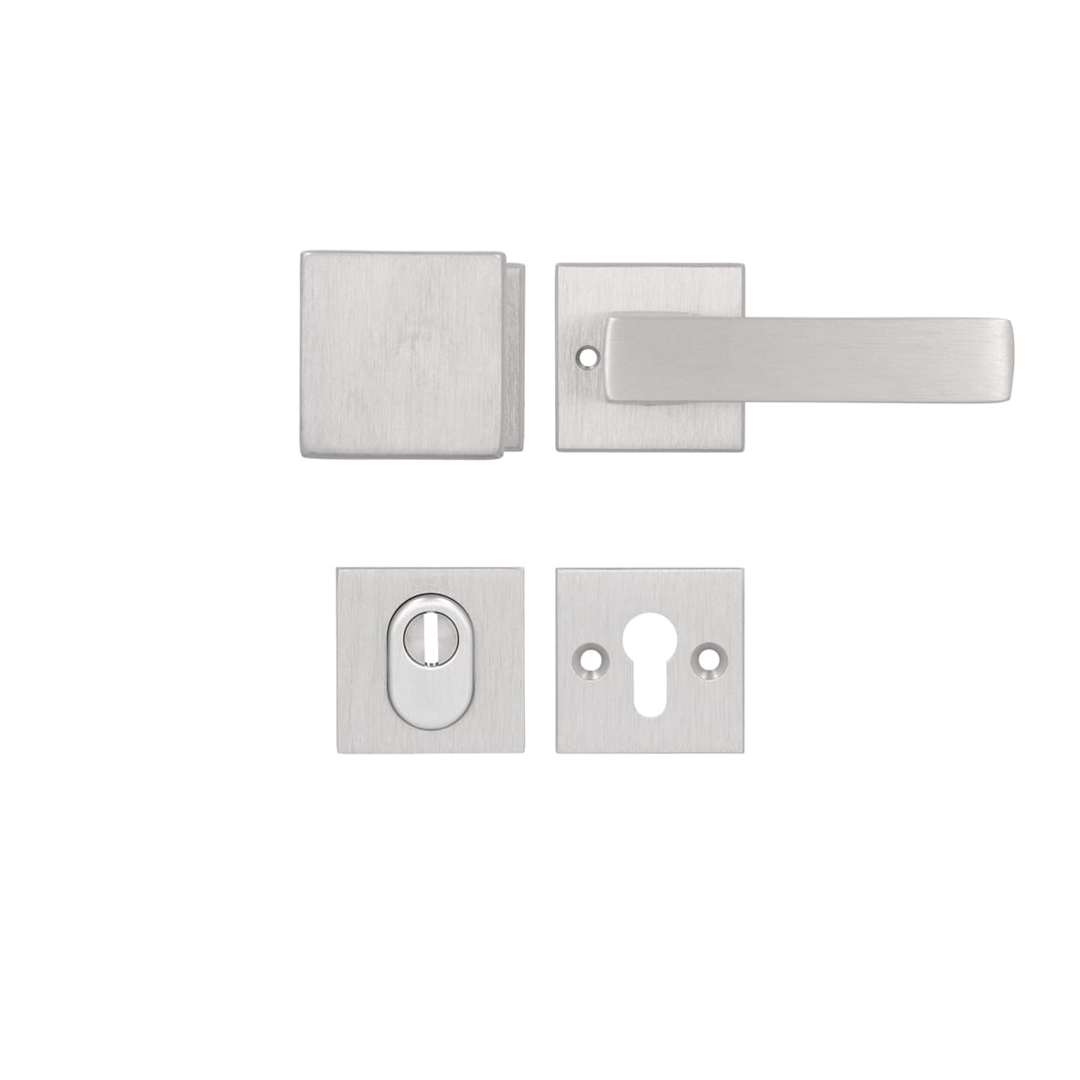 W komplecie znajdują się dwie klamki oraz dwa dolne szyldy do zamka z otworem na wkładkę.