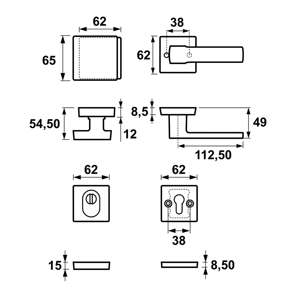 W standardzie : trzpień 150 mm(pływający) do klamki, śruby 100 mm.