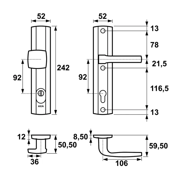 W zestawie znajduje się szyld z gałką od strony zewnętrznej i szyld z klamką od strony wewnętrznej.