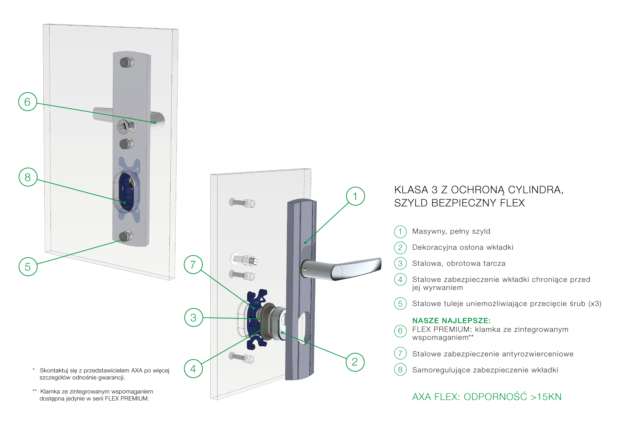 Flex – samoregulujące zabezpieczenie wkładki: System FLEX, opatentowany przez firmę AXA, zapewnia dodatkową ochronę mechanizmu zamykania, zwiększając bezpieczeństwo i niezawodność klamki.