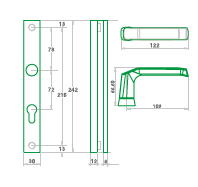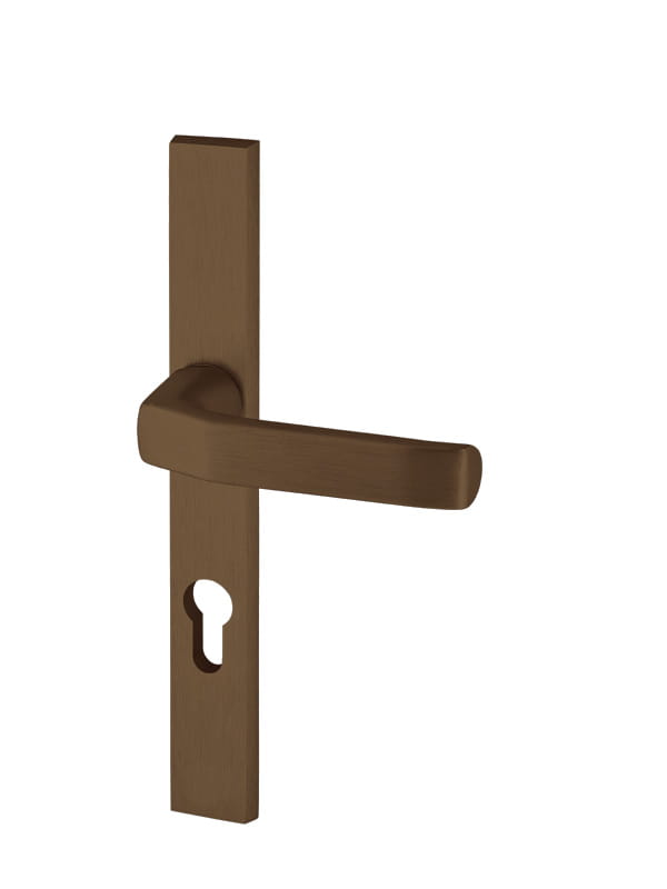 Okucie aluminiowe przeznaczone do drzwi zewnętrznych i wewnętrznych wykonanych również w systemie stolarki aluminiowej jak i profilach drewnianych. Wykonane z masywnego profilu aluminiowego, szlifowane i anodowane.