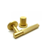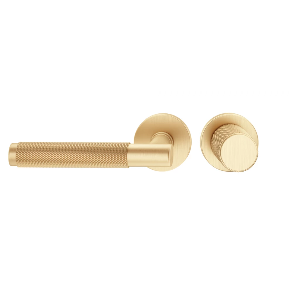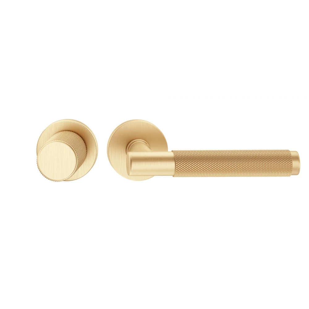 Przedstawiamy klamko-gałkę z serii TIME w eleganckim wykończeniu matowego mosiądzu – harmonijne połączenie nowoczesnego designu z funkcjonalnością. Zarówno klamka, jak i gałka posiadają charakterystyczne radełkowanie krzyżowe, które nie tylko dodaje im unikalnego wyglądu, ale również zapewnia pewny i komfortowy chwyt. To zestawienie idealnie komponuje się zarówno w aranżacjach industrialnych, jak i glamour.