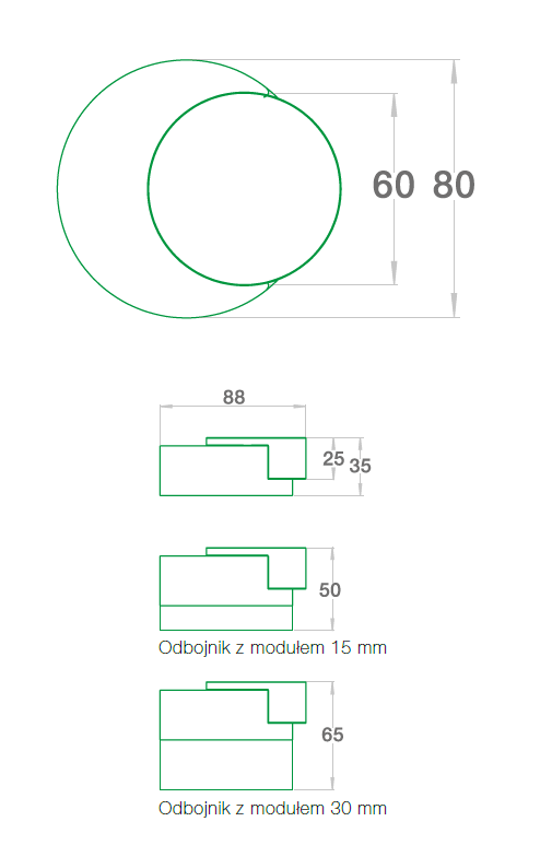 Możliwość dostosowania wysokości odbojnika do wysokości dolnej krawędzi drzwi poprzez montaż na modułach podwyższających.