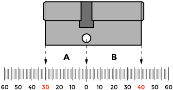 2. Zmierz odległości od osi zamka do drugiej krawędzi drzwi (od śruby montażowej wkładki)- jest to wymiar B do którego należy dodać grubość szyldu (dodatkowej rozety). Otrzymana suma jest minimalnym wymiarem B wkładki.