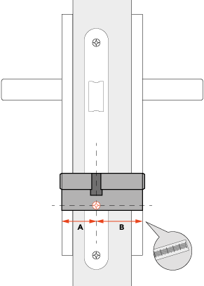 1. Zmierz odległości od osi zamka (od śruby montażowej wkładki) do pierwszej krawędzi drzwi - jest to wymiar A do którego należy dodać grubość szyldu (dodatkowej rozety). Otrzymana suma jest minimalnym wymiarem A wkładki.